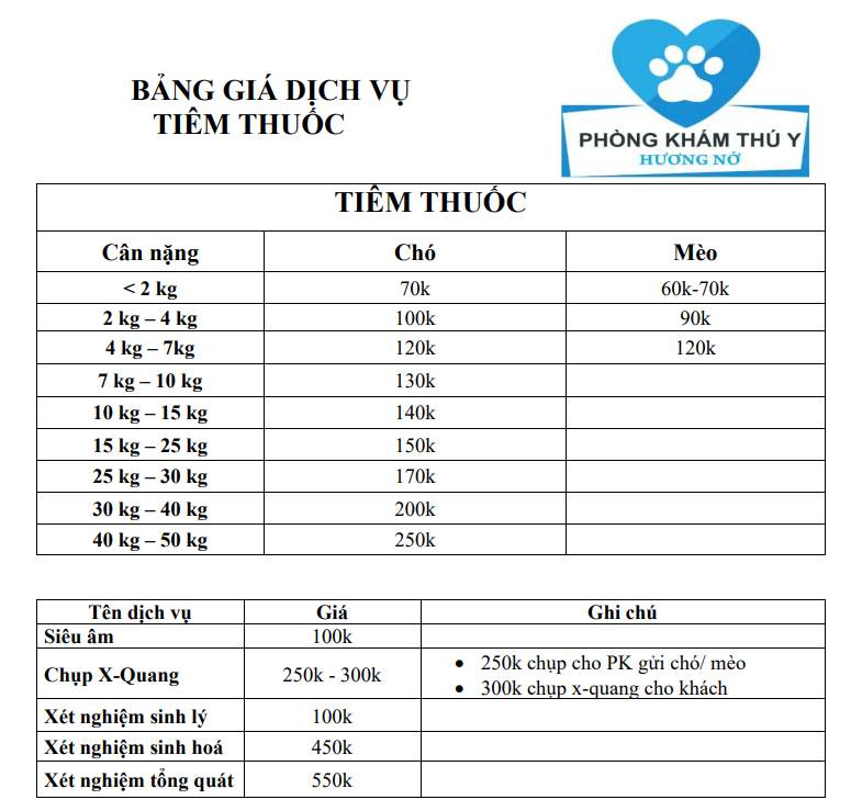 Bảng giá các dịch vụ cận lâm sàng đang áp dụng tại Thú Cưng Hương Nở: