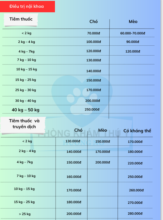 Bảng giá tiêm ngừa vaccine và điều trị bệnh của Thú Cưng Hương Nở: